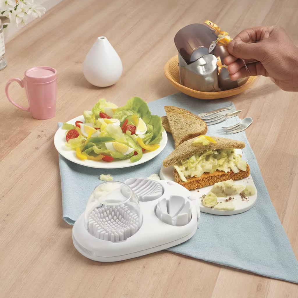 Com design ergonômico e estrutura resistente, o Fatiador Versátil Multiuso permite fatiar ovos, morangos, cogumelos, kiwi, batatas cozidas e muito mais com praticidade e zero esforço.