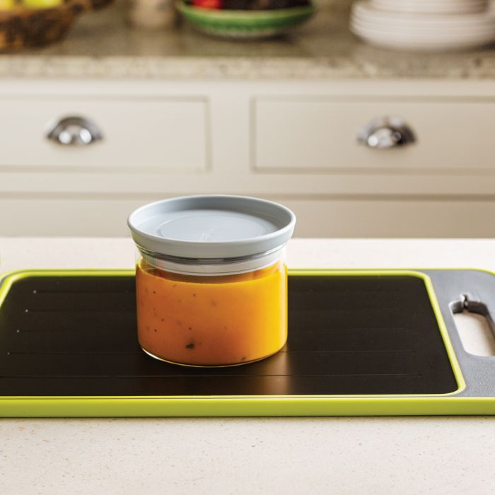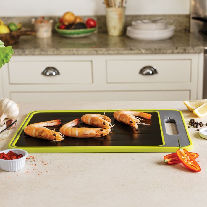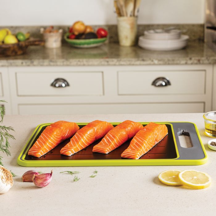 A Tábua Descongeladora para Cortes de ação rápida descongela com segurança sua comida até três vezes mais rápido do que deixá-la descongelar sozinha! Vire a tábua e é uma tábua de cortar prática e fácil de limpar. Tenha mais praticidade e eficiência na cozinha.